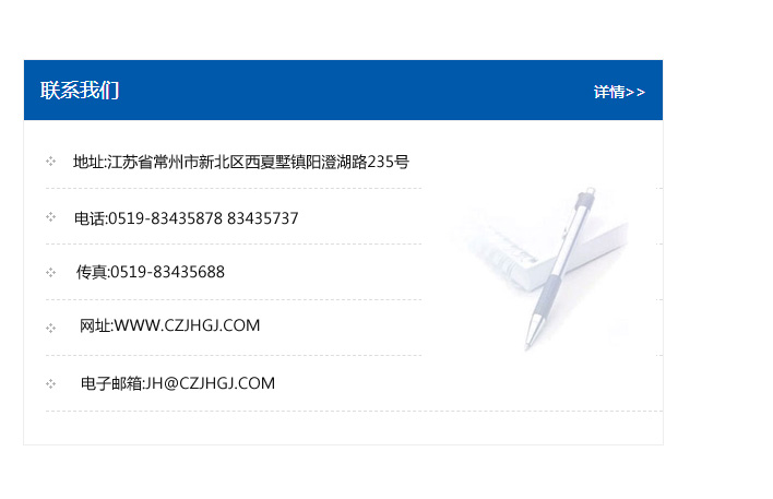 地址:常州市新北區友邦商務大廈1幢16、17層  電話:0519-85101652  傳真:0519-85112595  郵編:213022  網址:www.cz-jiayue_cn.zalbao.com  郵箱:xiajifengaa@163.com